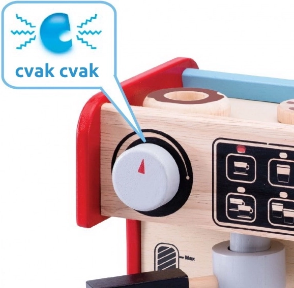 Με αυτή την καφετιέρα τα παιδιά μπορούν να δοκιμάσουν πώς είναι να είναι μπαρίστα. Το σετ περιλαμβάνει καφετιέρα με αποσπώμενη λαβή και κινούμενο διανεμητή γάλακτος. Συμπληρώνεται από οθόνη ελέγχου με περιστρεφόμενο κουμπί που «κλικάρει» και ζωγραφιστά πλήκτρα.