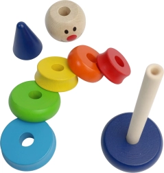 Χάρη στα διαφορετικά μεγέθη των δακτυλίων, τα παιδιά εξασκούν τη λεπτή κινητικότητα, τη λογική σκέψη και την υπομονή. Τα ζωηρά χρώματα ενισχύουν τη οπτική αντίληψη και τη μάθηση χρωμάτων και σειράς. Η ξύλινη κατασκευή εξασφαλίζει ανθεκτικότητα και ασφαλές παιχνίδι.