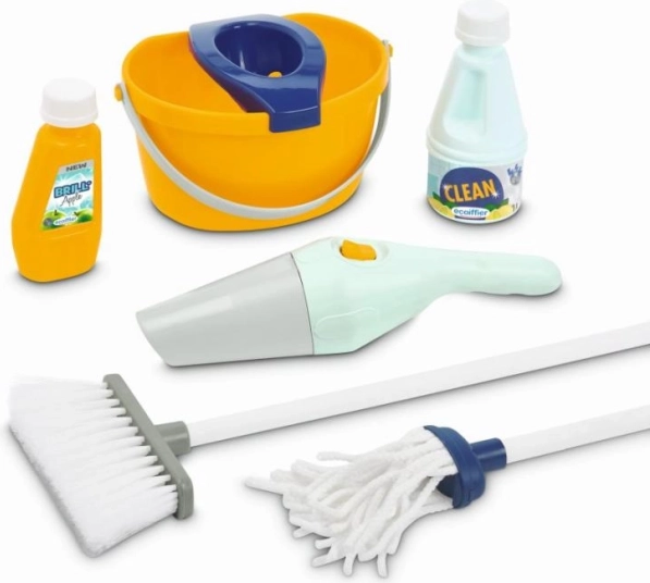 Το καροτσάκι περιλαμβάνει όλα τα απαραίτητα εργαλεία για παιχνίδι καθαρισμού, όπως σκουπάκι, σφουγγαρίστρα και χειροκίνητη ηλεκτρική σκούπα.
