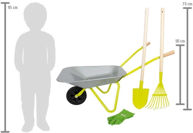 - Πρακτικές διαστάσεις: καροτσάκι περίπου 79 × 36 × 50 cm, ύψος λαβών 50 cm· μήκος φτυαριού και τσουγκράνας περίπου 73 cm.