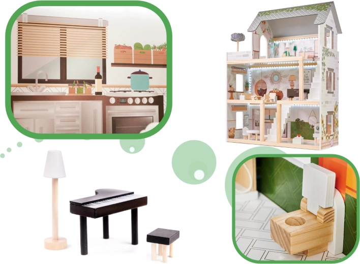 Το κουκλόσπιτο LULILO FLORO σε απαλό boho στυλ συνδυάζει φυσική εμφάνιση, κομψές λεπτομέρειες και λειτουργικά στοιχεία για μικρούς αφηγητές ιστοριών. Τα παιδιά θα λατρέψουν τα τέσσερα επιπλωμένα δωμάτια – κουζίνα, μπάνιο, σαλόνι και υπνοδωμάτιο – καθώς και τη ευρύχωρη βεράντα με ξαπλώστρα και ομπρέλα. Ο ενσωματωμένος φωτισμός LED υπογραμμίζει την ατμόσφαιρα του παιχνιδιού την ημέρα και το βράδυ.