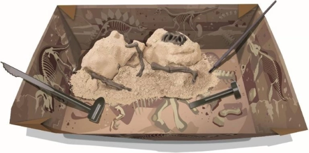 Τα παιδιά αποκαλύπτουν σταδιακά κρυμμένα απολιθώματα στο γύψινο μπλοκ και μαθαίνουν υπομονή και σωστές τεχνικές ανασκαφής. Ρεαλιστική εμπειρία ερευνητικής δουλειάς στο σπίτι.