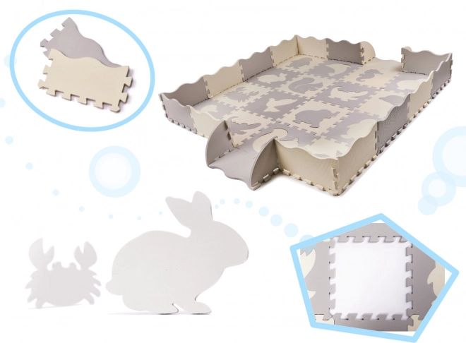 Μεγάλα αφρώδη κομμάτια με αποσπώμενα ζωικά σχήματα ενισχύουν την εκμάθηση σχημάτων, τη δημιουργικότητα και τη λεπτή κινητικότητα. Από τα κομμάτια συναρμολογείτε εύκολα επίπεδο χαλάκι ή περίφραξη με υπερυψωμένες άκρες που ορίζει μια ασφαλή ζώνη παιχνιδιού. Η υφασμένη επιφάνεια είναι ευχάριστη στην αφή και δεν γλιστρά.