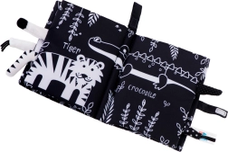 Αυτό το μαλακό αισθητηριακό βιβλιαράκι είναι ιδανικός σύντροφος για μωρά από 0+. Οι ασπρόμαυρες εικονογραφήσεις υψηλής αντίθεσης με ζώα σαφάρι (καμηλοπάρδαλη, λέοντας, ελέφαντας, μαϊμουδάκι, τιγράκι, κροκόδειλος) τραβούν την προσοχή και υποστηρίζουν τη σωστή ανάπτυξη της όρασης τους πρώτους μήνες. Οι προεξέχουσες μαλακές ουρές προσκαλούν στο άγγιγμα και εξασκούν το πιάσιμο.