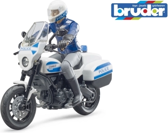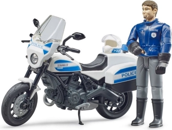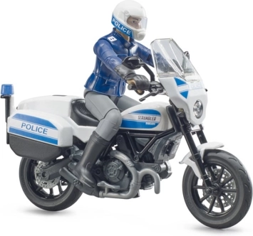 Η αστυνομική μοτοσικλέτα DUCATI Scrambler από την Bruder είναι ένα προσεγμένο μοντέλο για μικρούς και μεγάλους φίλους των σωστικών δυνάμεων. Διαθέτει περιστρεφόμενο τιμόνι για εύκολους ελιγμούς και αναδιπλούμενο σταντ για σταθερή στάθμευση. Η φιγούρα του αστυνομικού έχει κινητά άκρα, ώστε να μπορεί να καθίσει σε θέση οδήγησης ή να σταθεί δίπλα στο όχημα.