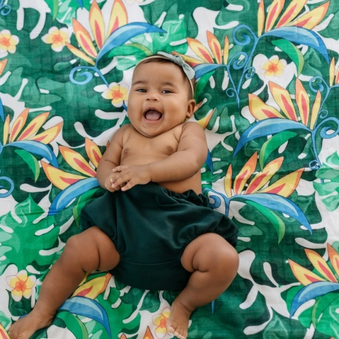 Ελαφριά και αφράτη μουσελίνα από μπαμπού-βαμβάκι Tommy Lise στο σχέδιο Lush Garden, απαλή για το δέρμα του μωρού, διαπνέουσα, δροσερή και ευχάριστη στην αφή. Χάρη στη μεγάλη διάσταση 120 × 120 cm μπορεί να χρησιμοποιηθεί ως κουβερτάκι, φασκιά και κάλυμμα κατά τον θηλασμό.