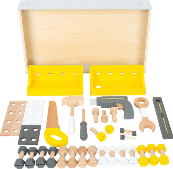 • Ξύλινα εργαλεία: Σετ οκτώ τεμαχίων που περιλαμβάνει σφυρί, πριόνι, κατσαβίδι και άλλα, προσφέροντας στα παιδιά την πλήρη εμπειρία ενός αληθινού εργαστηρίου.