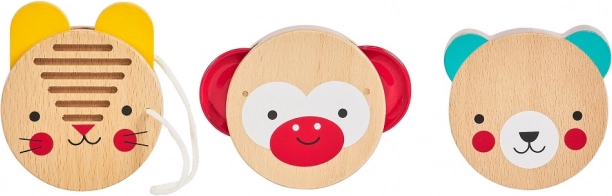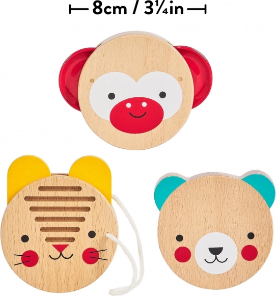 Τρία απλά κρουστά με μοτίβα ζωάκια ενισχύουν τη φυσική αίσθηση του ρυθμού και τη χαρά του μουσικού παιχνιδιού ήδη από πολύ μικρή ηλικία.
