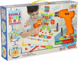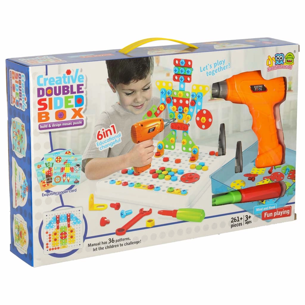 Διασκεδαστικό εκπαιδευτικό κατασκευαστικό σετ για μικρούς μαστόρους με ηλεκτρικό παιχνιδιάρικο τρυπάνι, βίδες και διάτρητη μοζαϊκή βάση. Τα παιδιά εξασκούν τη λεπτή κινητικότητα, την δημιουργικότητα και την τεχνική σκέψη συνθέτοντας πολύχρωφα μοτίβα και δικές τους κατασκευές. Το πρακτικό βαλιτσάκι διευκολύνει τη μεταφορά και το πλούσιο σετ 261 κομματιών εξασφαλίζει ώρες υπέροχου παιχνιδιού.