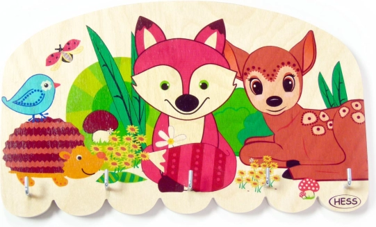 Σχεδιαστική ξύλινη κρεμάστρα με μοτίβο δασικών ζωών για κλειδιά, κοσμήματα και μικροαντικείμενα. Προσφέρει 5 μεταλλικούς γάντζους, είναι χειροποίητα ζωγραφισμένη και κατασκευασμένη στη Γερμανία. Εύκολη εγκατάσταση χάρη στις προτρυπημένες οπές.