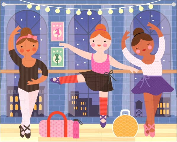 Ένα παζλ, δύο όμορφες σκηνές μπαλέτου. Τα παιδιά μπορούν να εναλλάσσουν τα μοτίβα και να συνθέτουν ξανά και ξανά νέες εικόνες.