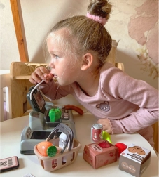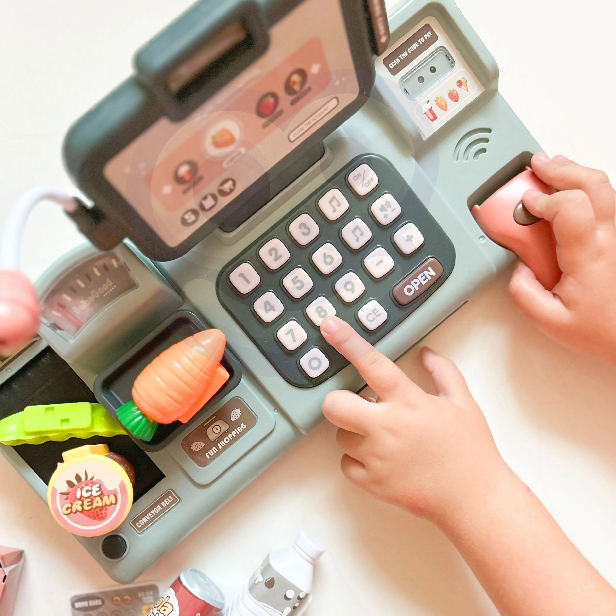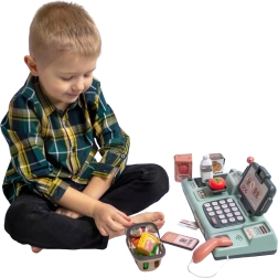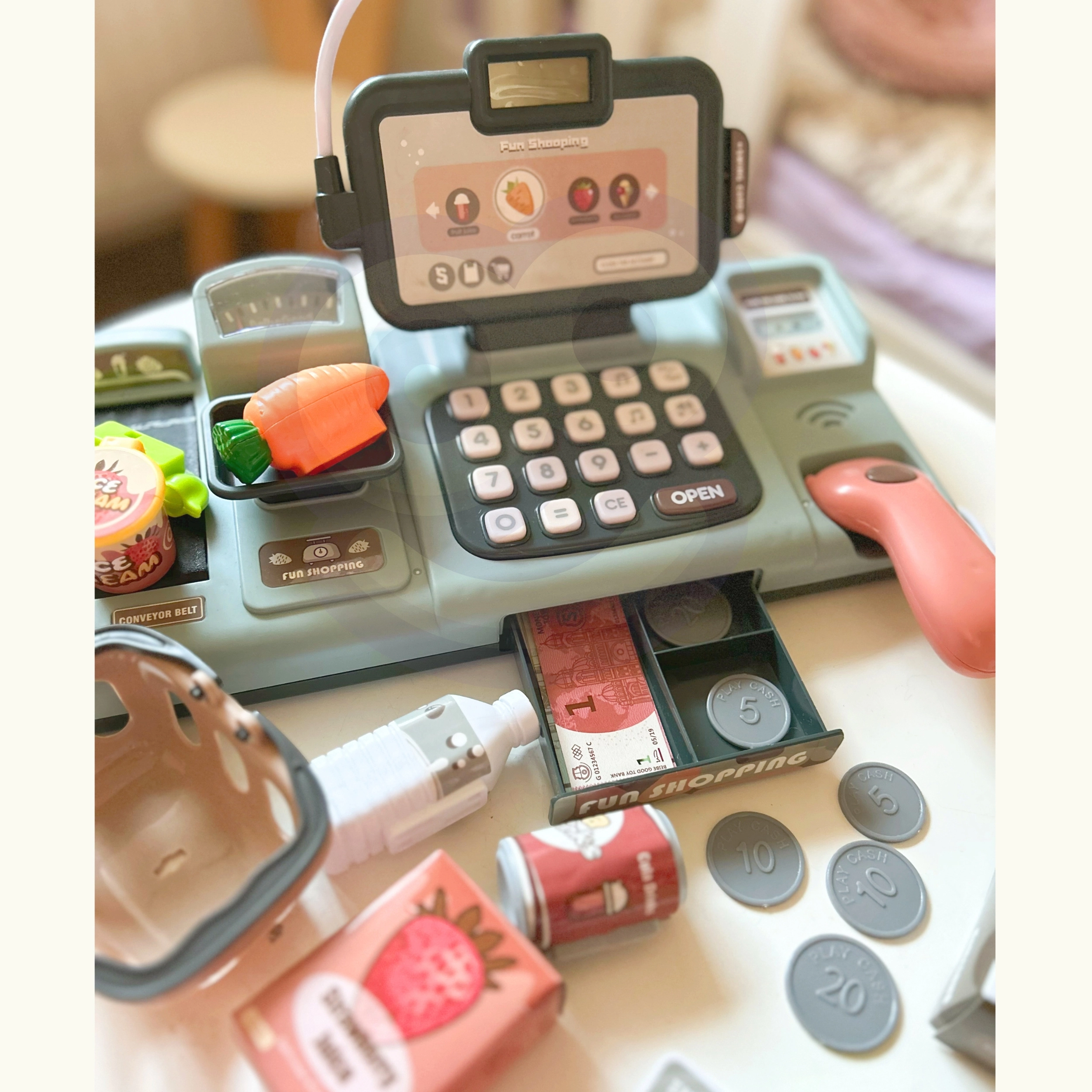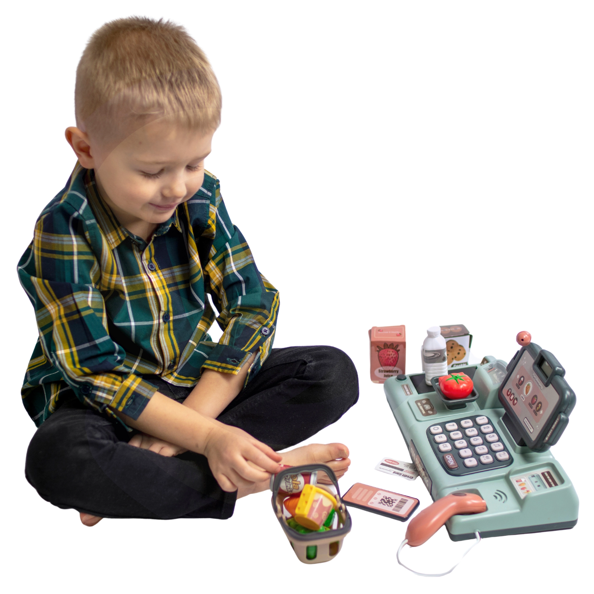 Το ταμείο περιλαμβάνει τερματικό, χάρη στο οποίο το παιδί μπορεί να πραγματοποιεί πληρωμές με μετρητά, κάρτα ή smartphone, όπως οι ενήλικες στο κατάστημα. Η ενσωματωμένη ζυγαριά και κινούμενος ιμάντας επιτρέπουν στο παιδί να οργανώνει τις αγορές και να βιώνει τον πραγματικό ρόλο του πωλητή.