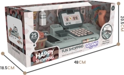 Περιλαμβάνονται ταμείο με ζυγαριά, τερματικό, αριθμομηχανή, σκάνερ και πολλά αξεσουάρ, συμπεριλαμβανομένου παιχνιδιού-smartphone και διαφόρων ειδών πλαστικών τροφίμων.