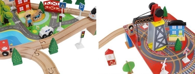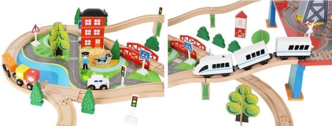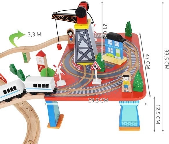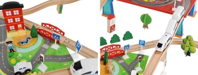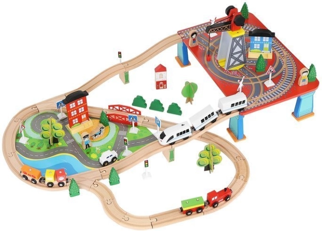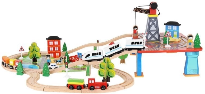 Ξύλινη σιδηροδρομική πίστα με συνολικά 88 προσεκτικά κατασκευασμένα στοιχεία, συμπεριλαμβανομένων σιδηροτροχιών, εμπορικού και επιβατικού τρένου, αυτοκινήτου, δενδρυλλίων και πινακίδων κυκλοφορίας. Η διασκέδαση έγκειται στη δυνατότητα δημιουργίας δικής σας διαδρομής, ενώ η μαγνητική σύνδεση των επιμέρους τμημάτων εξασφαλίζει εύκολο χειρισμό.