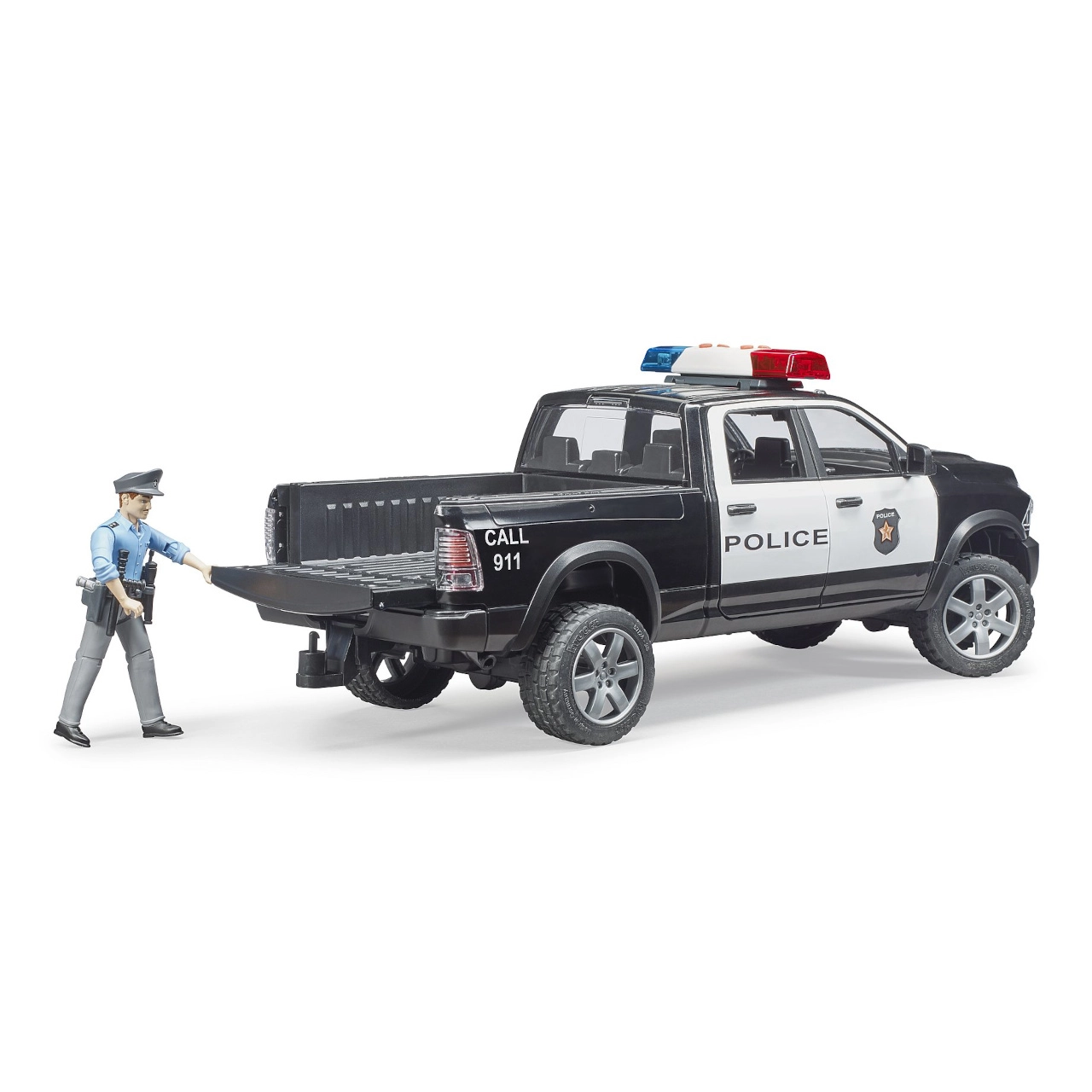 Το αστυνομικό pick-up BRUDER RAM προσφέρει στα παιδιά αυθεντική δράση και πολλές δυνατότητες παιχνιδιού. Χάρη στη στιβαρή κατασκευή από ποιοτικό πλαστικό ABS, τα ρεαλιστικά στοιχεία και τις λειτουργικές λεπτομέρειες, αντεπεξέρχεται σε κάθε αποστολή – από περιπολίες στην πόλη μέχρι επιχειρήσεις σε δάση ή βουνά.