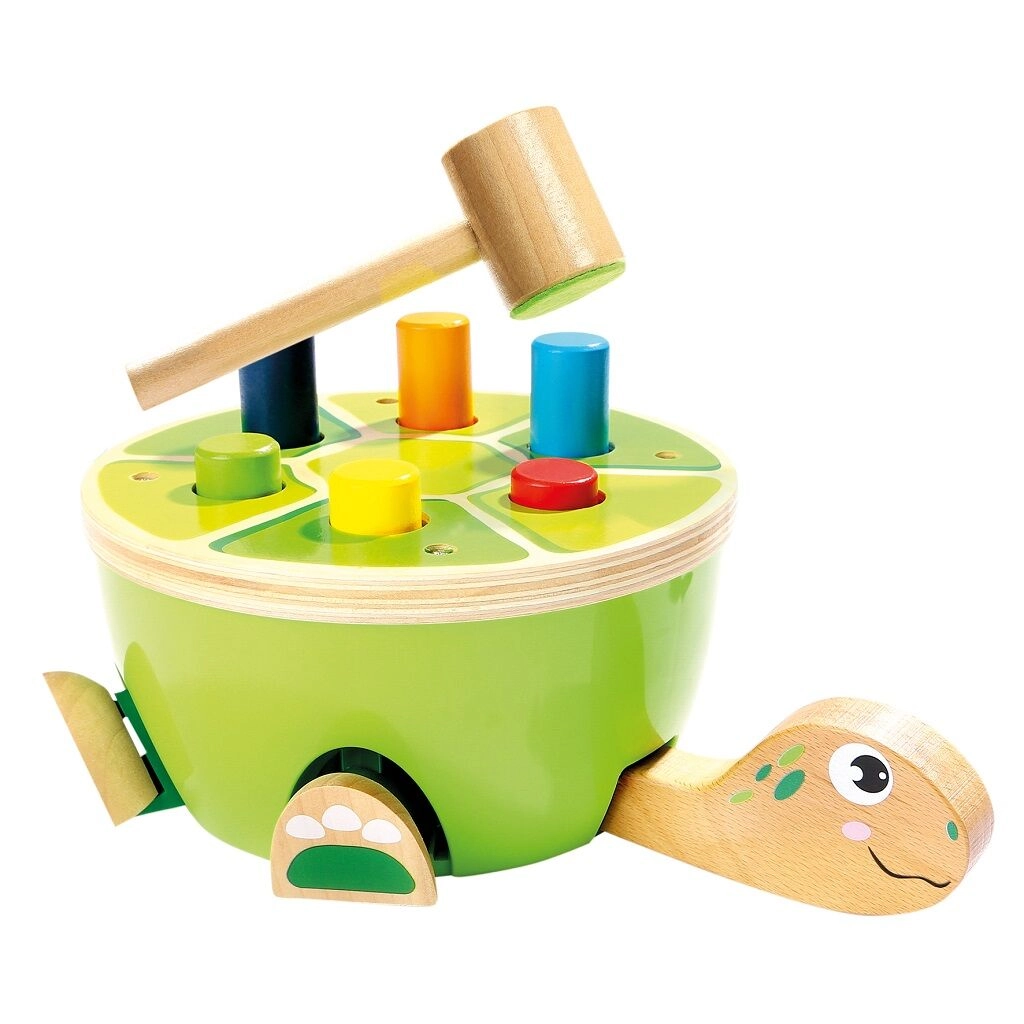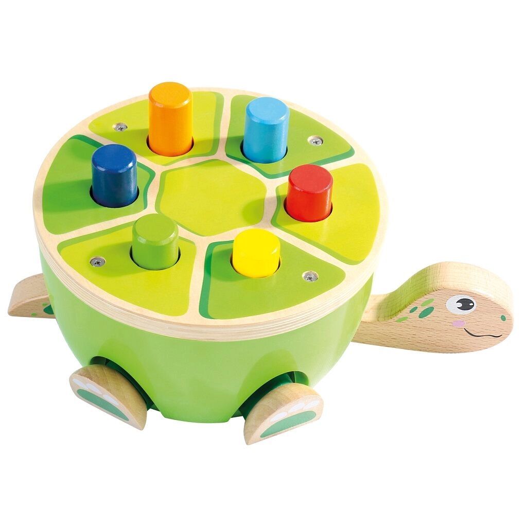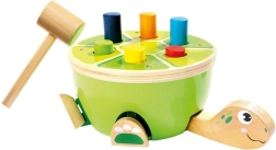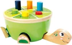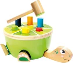 Αυτή η χελώνα-σφυροκόπημα της Bino είναι ιδανική επιλογή για τα πρώτα κινητικά παιχνίδια. Τα παιδιά, με το ξύλινο σφυράκι που έχει μαλακή τσόχινη επένδυση, καρφώνουν με ασφάλεια τα χρωματιστά πασαλάκια στο καβούκι. Κατά τη διάρκεια του παιχνιδιού αναπτύσσονται φυσικά η λεπτή κινητικότητα, ο συντονισμός χεριού–ματιού και η συγκέντρωση, ενώ ο χαρούμενος σχεδιασμός κρατά το ενδιαφέρον για πολλή ώρα.