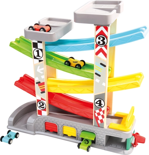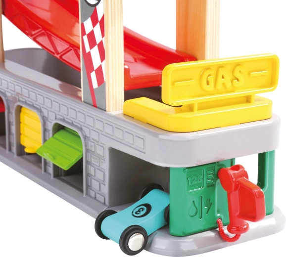 Η σταθερή κατασκευή από ανθεκτικά υλικά αντέχει στο καθημερινό παιχνίδι, ενώ τα πρακτικά γκαράζ χρησιμεύουν και για αποθήκευση και μεταφορά των αυτοκινήτων. Τα έντονα χρώματα και τα αριθμημένα επίπεδα βοηθούν στην αναγνώριση χρωμάτων και στις βασικές μετρήσεις. Στη συσκευασία περιλαμβάνονται τέσσερα αυτοκινητάκια με ομαλή κύλιση για άμεσους αγώνες.