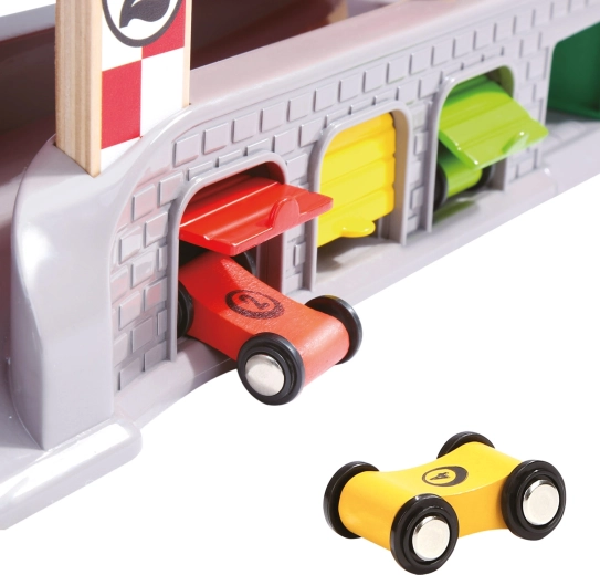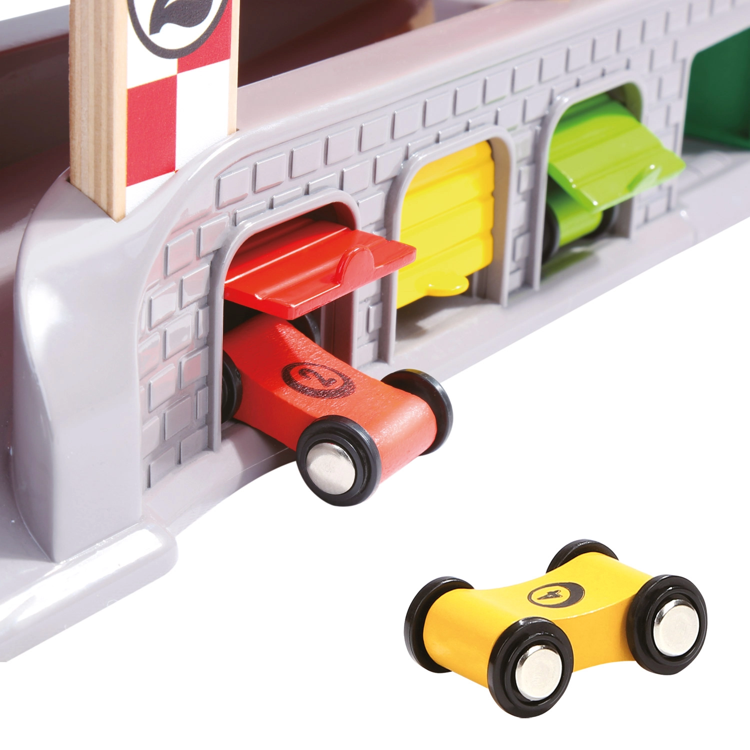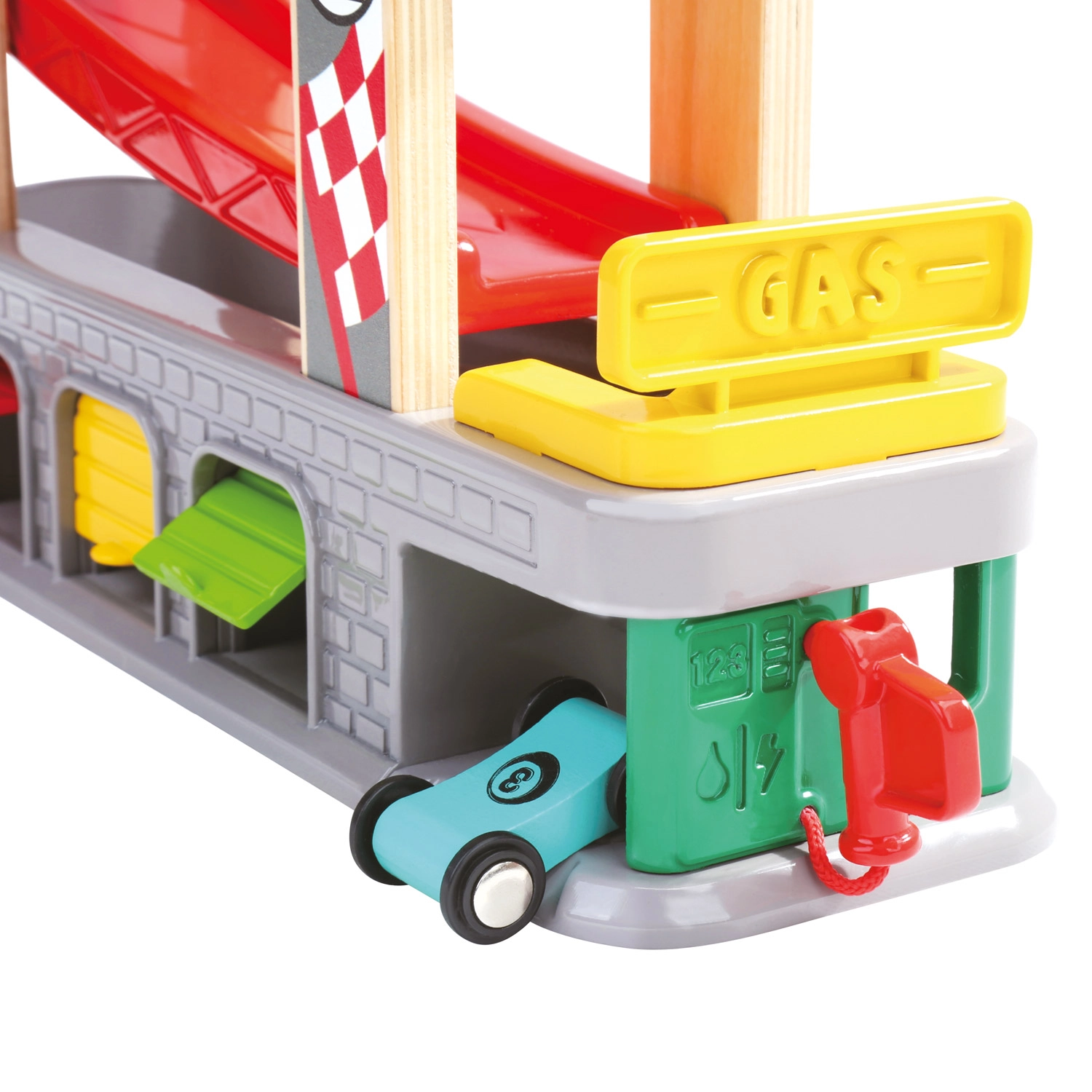 Ξεκινήστε τους αγώνες στο φουλ με μια πίστα που προσφέρει διπλές εκκινητικές πλατφόρμες, πιτ για ανεφοδιασμό και τρία γκαράζ με ανοιγόμενες πορτούλες. Ο στιβαρός συνδυασμός ξύλου, πλαστικού και μετάλλου εξασφαλίζει αντοχή, ενώ τα ζωντανά χρώματα τραβούν την προσοχή και ενισχύουν τη φαντασία των παιδιών. Περιλαμβάνονται 4 αυτοκινητάκια σε διαφορετικά χρώματα για ατελείωτη αγωνιστική διασκέδαση.
