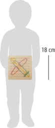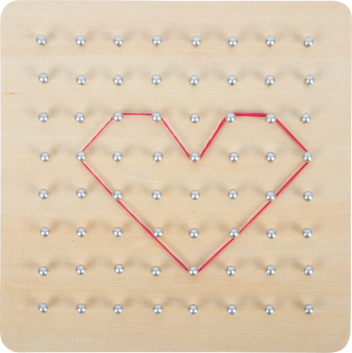 Ο Ξύλινος πίνακας Geoplan διαθέτει 64 ομοιόμορφα κατανεμημένους πασάλους πάνω σε σταθερή ξύλινη βάση διαστάσεων 18 x 18 x 2 cm. Χάρη στα 48 πολύχρωμα λαστιχάκια, τα παιδιά μπορούν να δημιουργήσουν αμέτρητα μοτίβα και σχήματα, από απλές γεωμετρικές μορφές έως σύνθετες συνθέσεις. Το σετ περιλαμβάνει επίσης 23 κάρτες με σχέδια που βοηθούν στην εξάσκηση του χωρικού σχεδιασμού και της λογικής σκέψης.