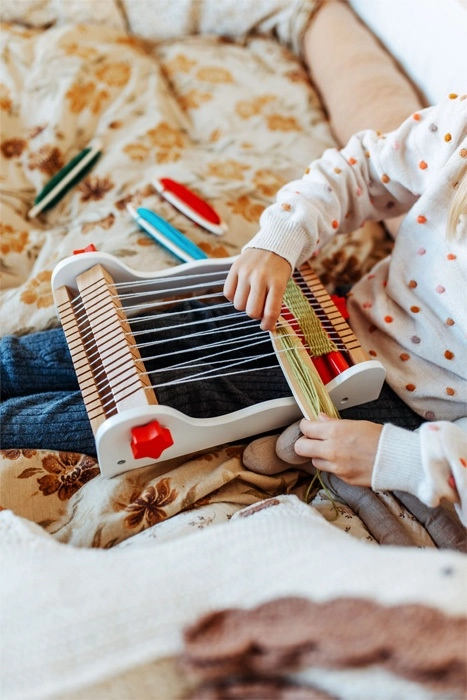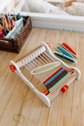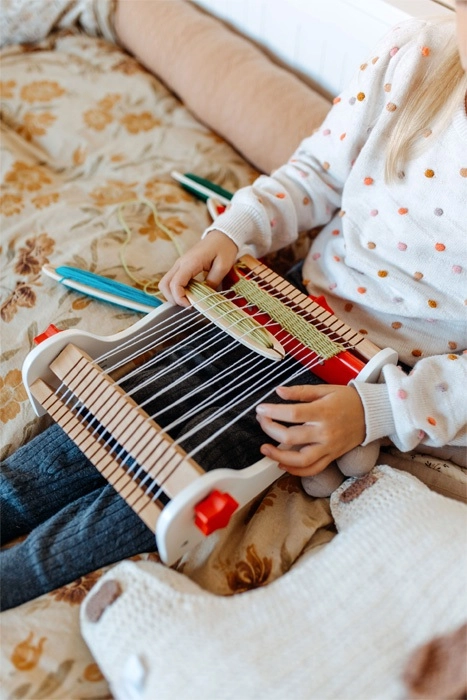 Η συμπαγής επιτραπέζια κατασκευή με καθαρή καθοδήγηση στημόνιου και απλή διέλευση υφαδιού βοηθά τα παιδιά να κατανοήσουν τις βασικές αρχές της ύφανσης από την πρώτη κιόλας προσπάθεια.
