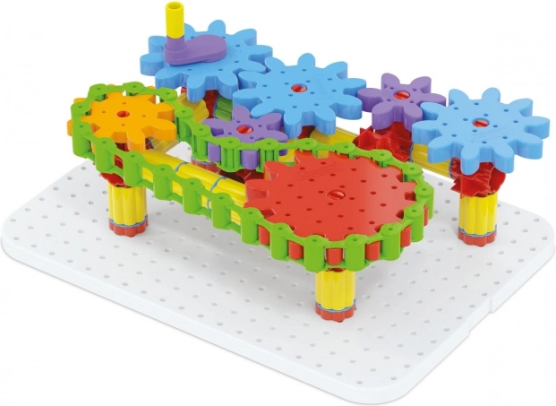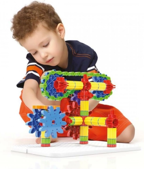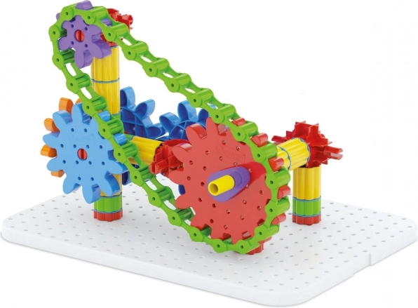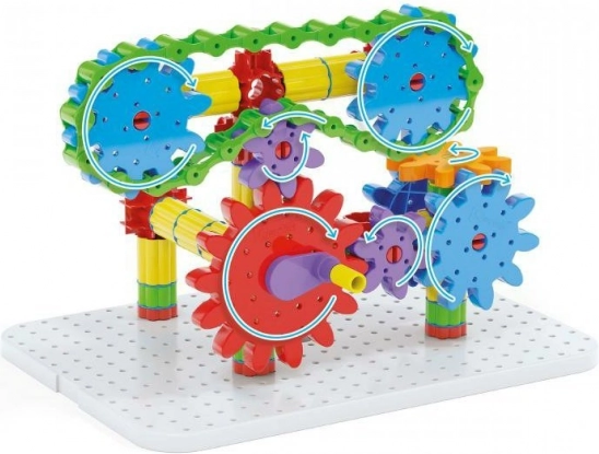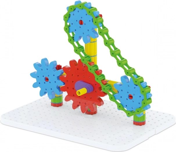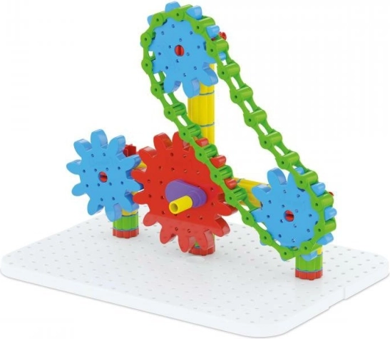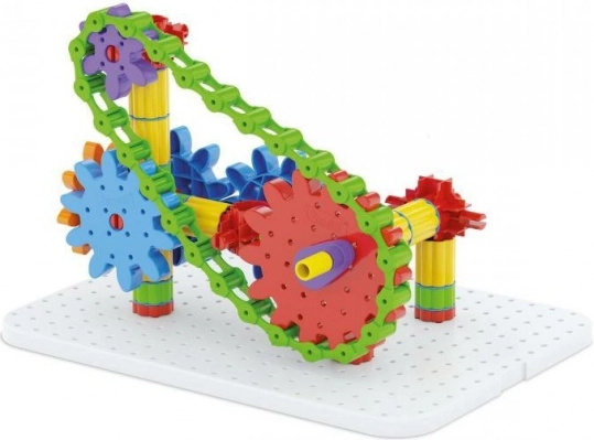 Το σετ είναι κατασκευασμένο από ανθεκτικό πλαστικό και προτείνεται για παιδιά από 5 ετών. Περιλαμβάνει στοιχεία όπως λευκή βάση, γρανάζια διαφόρων μεγεθών, αλυσίδα και πολλά ακόμη, επιτρέποντας στα παιδιά να ανακαλύψουν έναν νέο κόσμο μηχανικών κινήσεων.