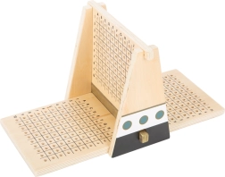 Εντοπίστε τα πλοία του αντιπάλου και προστατέψτε τον στόλο σας στη μοντέρνα ξύλινη εκδοχή της Ναυμαχίας. Η κεντρική πλάκα εξασφαλίζει ιδιωτικότητα στην ανάπτυξη και καθαρή σήμανση επιτυχιών και αστοχιών – μπλε σημαιάκια για τον γύρω χώρο των πλοίων, λευκά για τα άμεσα χτυπήματα. Χάρη στους μαγνήτες στο πλαίσιο, όλη η κατασκευή είναι στιβαρή και σταθερή, ώστε όλα να μένουν στη θέση τους ακόμα και σε συναρπαστικές μονομαχίες.