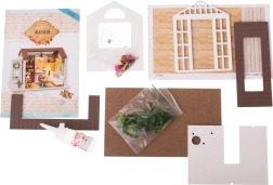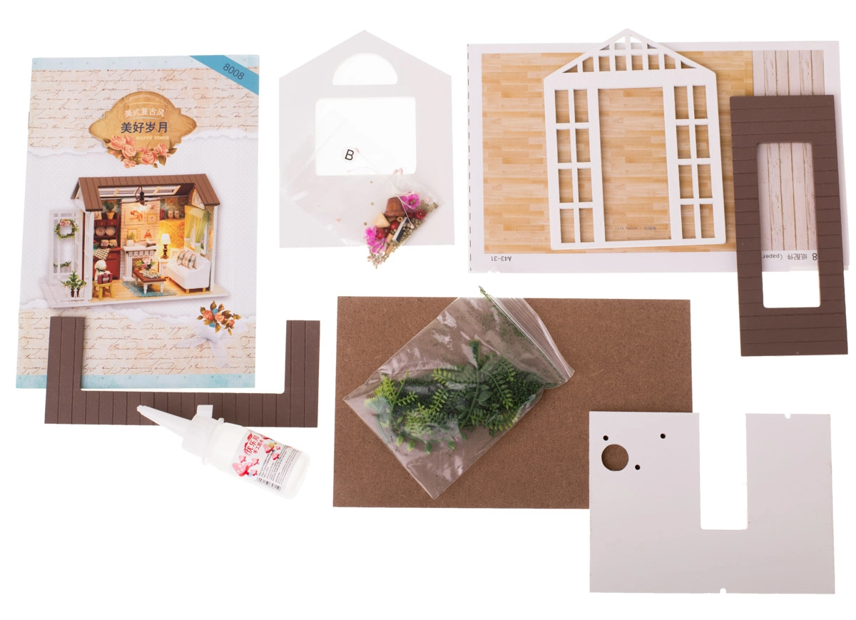 Το σετ περιλαμβάνει όλα τα απαραίτητα για την κατασκευή του σαλονιού και τον εξοπλισμό του, συμπεριλαμβανομένης της κόλλας και αναλυτικών εικονογραφημένων οδηγιών. Ο LED φωτισμός, που περιλαμβάνεται στη συσκευασία, λειτουργεί με μπαταρίες (2x AAA 1,5V και 3x 1,5V LR54 - οι μπαταρίες δεν περιλαμβάνονται) και ολοκληρώνει υπέροχα τη συνολική ατμόσφαιρα.