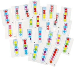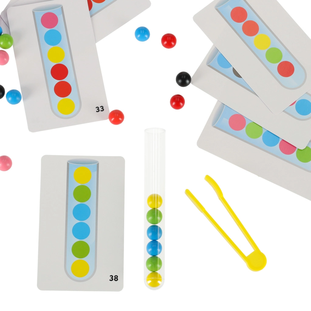 Περιλαμβάνει 24 διπλής όψης κάρτες που δείχνουν διάφορα μοτίβα για αναπαραγωγή μέσα στον δοκιμαστικό σωλήνα. Αυτές οι δραστηριότητες βοηθούν στην ανάπτυξη της σκέψης και της ικανότητας συγκέντρωσης των παιδιών.