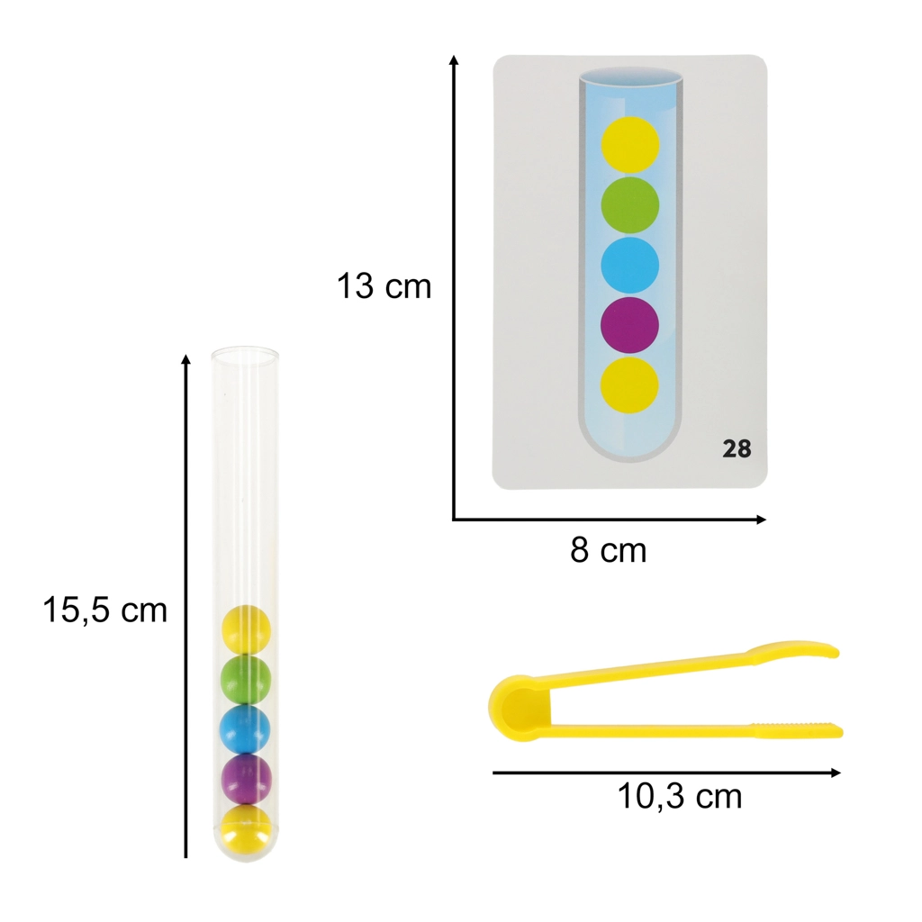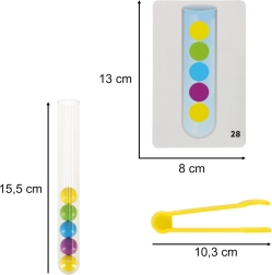 Ανακαλύψτε έναν διασκεδαστικό και διαδραστικό τρόπο για να ενισχύσετε τις δεξιότητες του παιδιού σας με αυτό το μεγάλο εκπαιδευτικό σετ. Το παιχνίδι επικεντρώνεται στην ταξινόμηση των μπιλιών στους σωστούς δοκιμαστικούς σωλήνες με τα χέρια ή με τις παρεχόμενες τσιμπίδες.