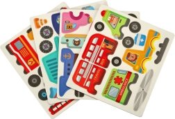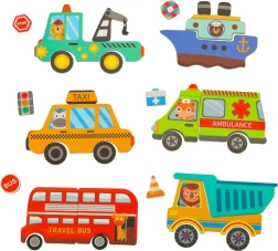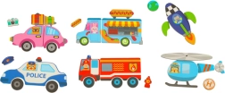 Λεωφορείο, ασθενοφόρο, ταξί, περιπολικό, φορτηγό, πλοίο και πύραυλος. Συμπληρωματικά στοιχεία όπως κώνοι και πινακίδες ζωντανεύουν κάθε σκηνή.