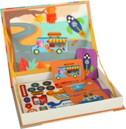 Δημιουργικό μαγνητικό παζλ σε πρακτική μορφή βιβλίου που θα ενθουσιάσει τους μικρούς εξερευνητές των μέσων μεταφοράς. Με 66 μαγνητικά κομμάτια και 6 διπλές κάρτες, τα παιδιά συνθέτουν 12 διαφορετικά οχήματα και δημιουργούν τις δικές τους ιστορίες. Ζωντανά χρώματα, εύκολη χρήση και εκπαιδευτική αξία ενισχύουν τη λεπτή κινητικότητα, τη δημιουργικότητα και την ανάπτυξη του λόγου.