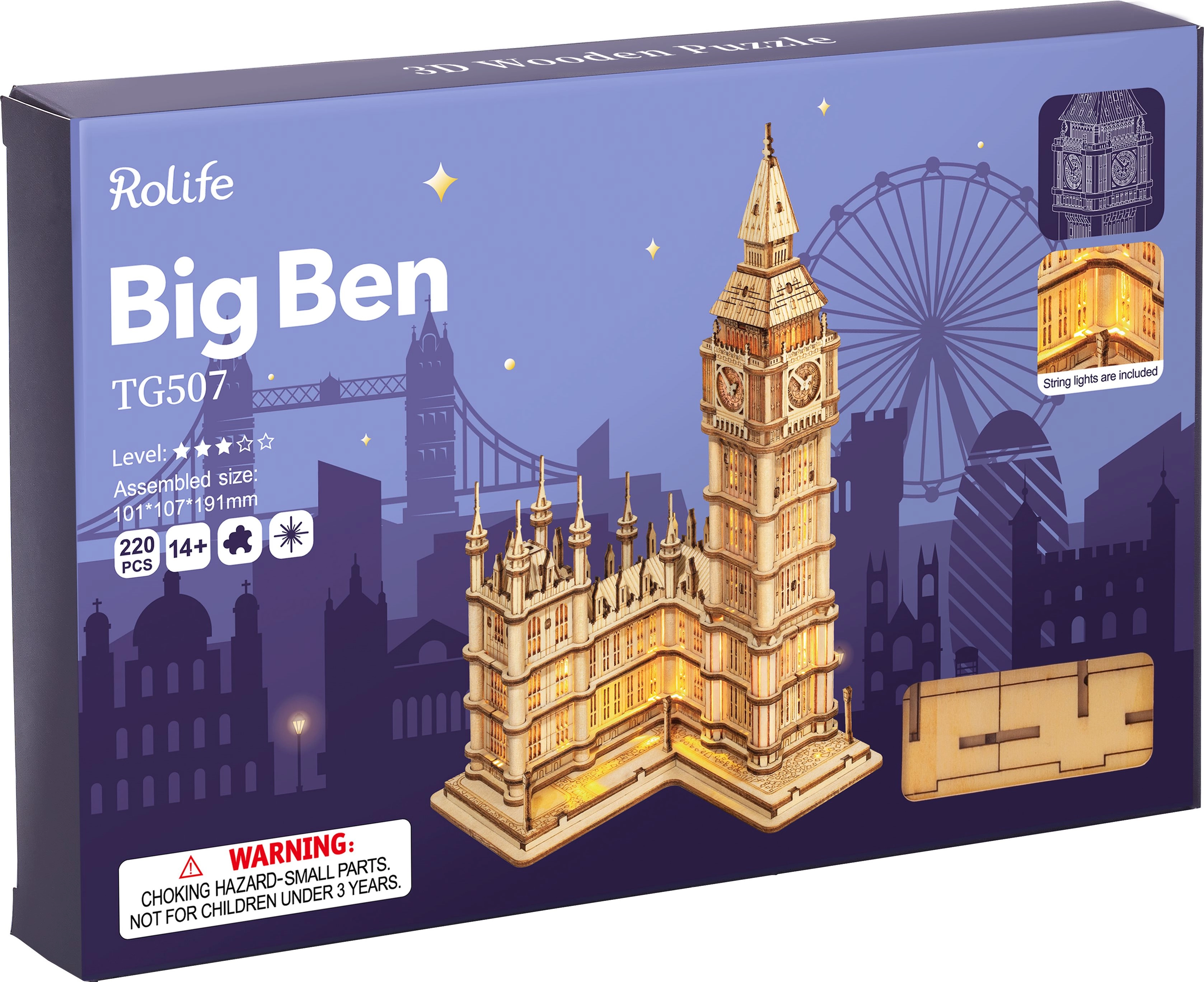 Φέρτε ένα κομμάτι του Λονδίνου στο σπίτι σας με το μοντέλο Big Ben από τη ROBOTIME. Ξύλινη κατασκευή με LED φωτισμό που αποδίδει πιστά τον εμβληματικό πύργο ρολογιού και μετατρέπεται σε κομψή διακόσμηση. Σας περιμένουν 220 με ακρίβεια κοµµένα τεµάχια, μεσαία δυσκολία και περίπου 1,5 ώρα διασκεδαστικής συναρμολόγησης. Ιδανικό δώρο για λάτρεις της αρχιτεκτονικής και πρωτότυπα 3D παζλ.