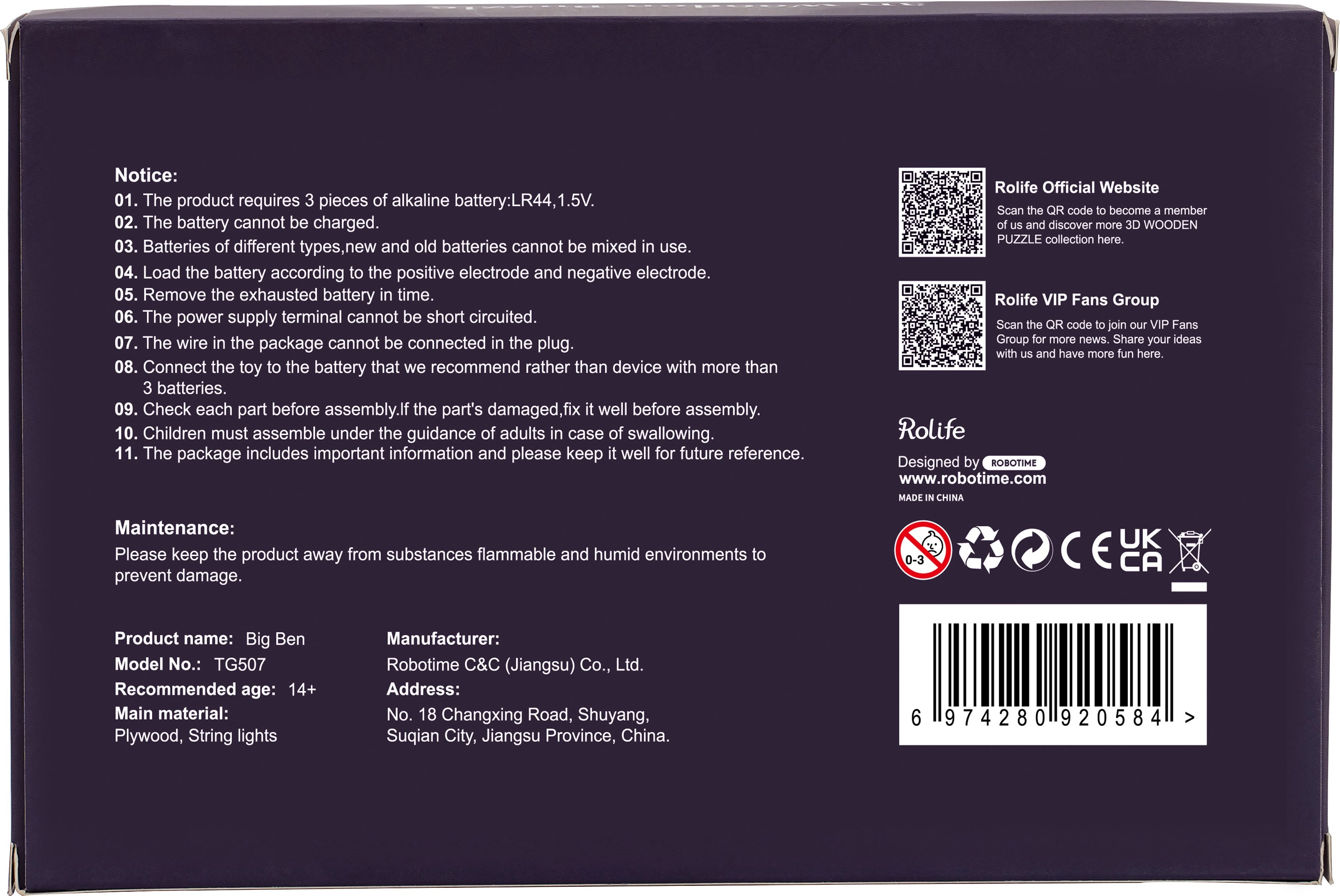 ROBOTIME ξύλινο 3D παζλ Big Ben – φωτιζόμενος πύργος ρολογιού