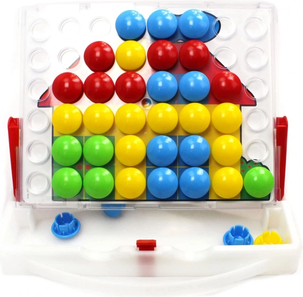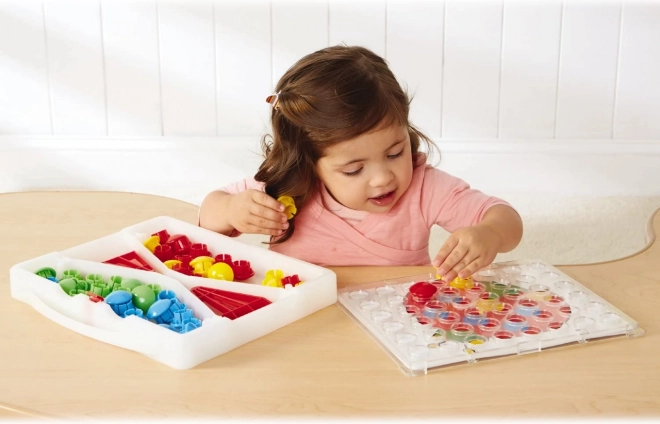 Το μωσαϊκό σε πρακτικό βαλιτσάκι επιτρέπει στα παιδιά να δημιουργούν χαρούμενες εικόνες σύμφωνα με τα παρεχόμενα πρότυπα ή με βάση τη δική τους φαντασία. Η βάση μπορεί να τοποθετηθεί στις υποδοχές και να χρησιμοποιηθεί και σε κάθετη θέση για ακόμη πιο άνετο παιχνίδι. Τα μεγάλα, πολύχρωμα καρφάκια είναι ασφαλή και εύκολα στον χειρισμό ακόμη και για τα μικρά παιδικά χέρια.