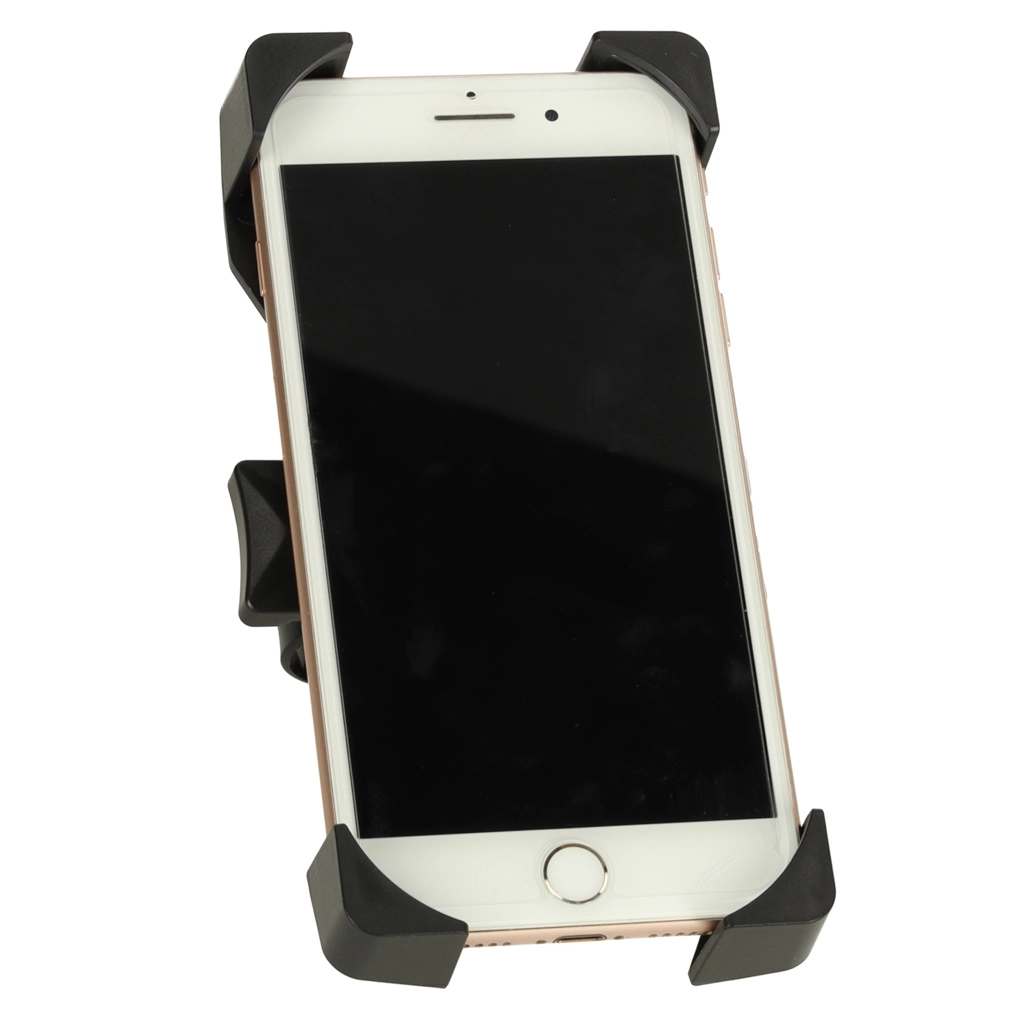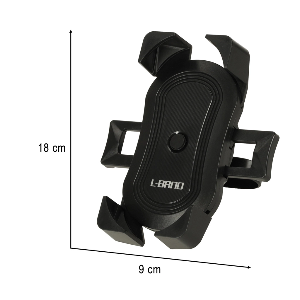 Τέσσερα γωνιακά στηρίγματα και ανθεκτική κατασκευή από ισχυρό πλαστικό κρατούν τη συσκευή με ασφάλεια στη θέση της, ακόμη και σε ανώμαλο έδαφος. Η ευρεία συμβατότητα (από περίπου 12 × 6 cm έως 18 × 9 cm) καλύπτει τα περισσότερα smartphones και συμπαγείς συσκευές πλοήγησης.