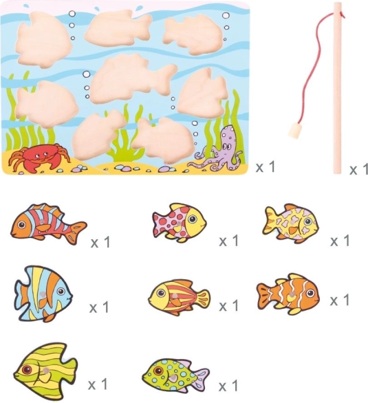 Διασκεδαστικό ξύλινο παιχνίδι για τους μικρούς, όπου τα παιδιά με τη βοήθεια μαγνητικού καλαμιού ψαρεύουν πολύχρωμα ψαράκια και τα επιστρέφουν στις σωστές οπές. Υποστηρίζει τη λεπτή κινητικότητα, τον συντονισμό ματιού–χεριού και τη συγκέντρωση. Κατασκευασμένο από ποιοτικό ξύλο από υπεύθυνες πηγές, πληροί τις ευρωπαϊκές προδιαγραφές ασφαλείας. Η συσκευασία περιλαμβάνει 10 κομμάτια.