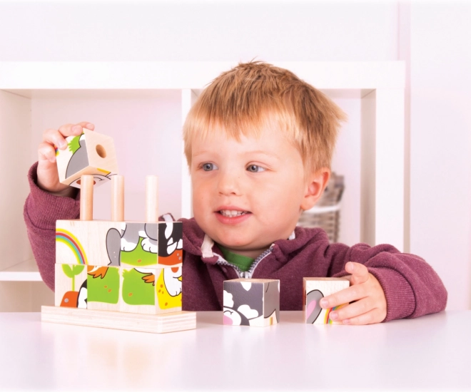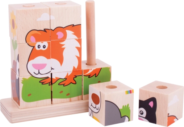 Οι ξύλινοι στοιβαζόμενοι κύβοι Bigjigs Baby είναι εξαιρετική επιλογή για τα πρώτα παζλ και συναρμολογήσεις. Τα παιδιά εξασκούν τη λαβή, την ευχέρεια των δακτύλων και την οπτική αντίληψη αναζητώντας τις σωστές πλευρές των κύβων και τοποθετώντας τους στους πασσάλους. Οι πολύχρωμες εικονογραφήσεις με ζωάκια παρακινούν σε επαναλαμβανόμενο παιχνίδι και ενισχύουν τη συγκέντρωση.