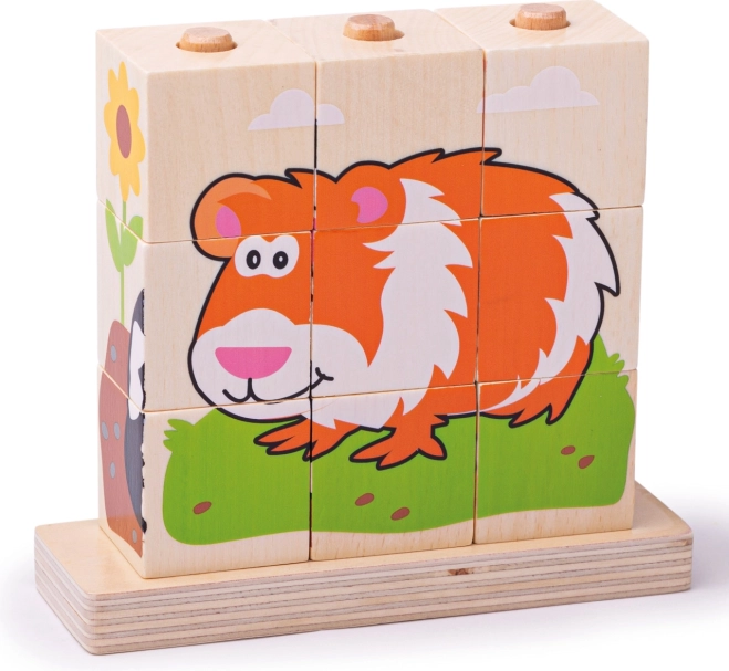 Το σετ περιλαμβάνει συνολικά 10 κομμάτια – 9 κύβους που δημιουργούν 4 διαφορετικές εικόνες και μια ξύλινη βάση με ράβδους για ασφαλή και τακτοποιημένη στοίβαξη. Το παιχνίδι είναι κατασκευασμένο από ανθεκτικό ξύλο με λεία επιφάνεια και πληροί τις τρέχουσες ευρωπαϊκές προδιαγραφές ασφαλείας.
