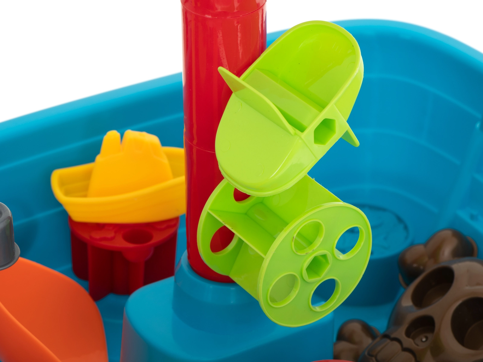 Η αμμοδόχος διαθέτει πολλά αξεσουάρ, συμπεριλαμβανομένων καλουπιών, κανονιών και μικρών σκαφών, που προσφέρουν στα παιδιά ατελείωτες δυνατότητες παιχνιδιού και κατασκευών.