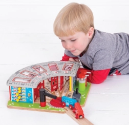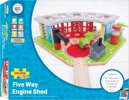 Η ξύλινη αποθήκη είναι σχεδιασμένη για πέντε διαφορετικά τρενάκια και περιλαμβάνει λειτουργική περιστροφική πλατφόρμα, που επιτρέπει την εύκολη μετακίνηση των τρένων μεταξύ των επιμέρους γκαράζ. Το σύστημα διαθέτει ανοιγόμενες πόρτες και αντλητικό σταθμό, συμβάλλοντας σε μια ρεαλιστική εμπειρία παιχνιδιού.