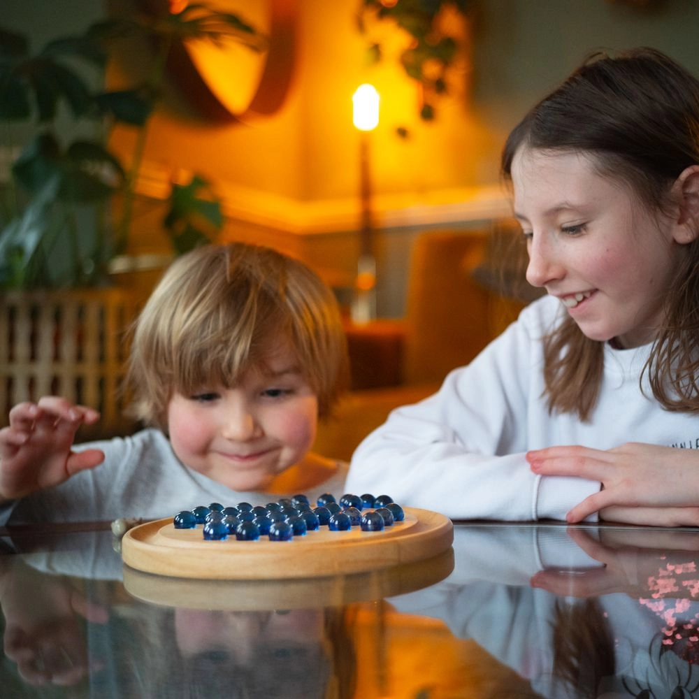 Η κυκλική ξύλινη βάση και οι γυαλιστερές γυάλινες μπίλιες προσφέρουν ευχάριστη αίσθηση στο παιχνίδι και μεγάλη αντοχή.
