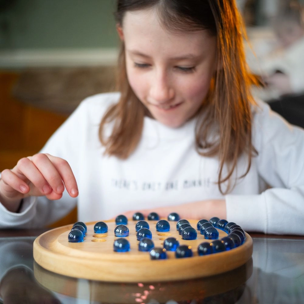 Ανακαλύψτε τη διαχρονική διασκέδαση με το ξύλινο σολιτέρ BIGJIGS TOYS. Οι γυαλιστερές μπλε μπίλιες και η προσεκτικά δουλεμένη κυκλική βάση δημιουργούν ένα κομψό λογικό παιχνίδι που δοκιμάζει την ευστροφία και την υπομονή σας. Στόχος είναι, πηδώντας μπίλια πάνω από μπίλια, να μείνει στο ταμπλό μόνο μία.