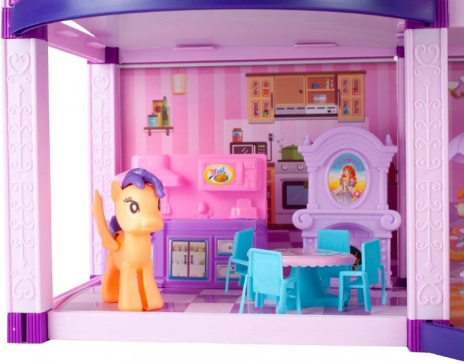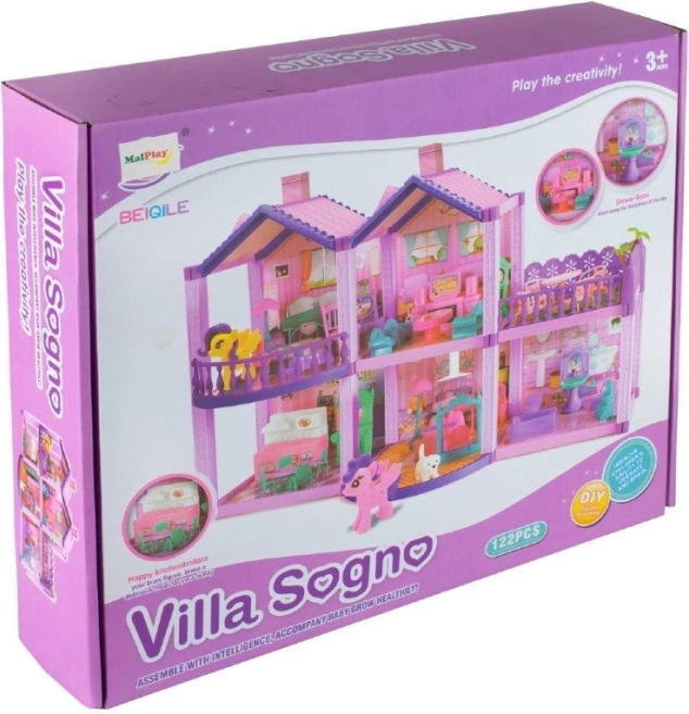 Η αξιολάτρευτη Villa είναι ένα προσεγμένο κουκλόσπιτο σε ροζ-μοβ αποχρώσεις με πολλούς χώρους, μπαλκόνι και ταράτσα. Με τις φιγούρες πόνι και σκυλάκι και το πλούσιο σετ επίπλων, τα παιδιά δημιουργούν τον δικό τους κόσμο και ατελείωτες ιστορίες. Το κουκλόσπιτο είναι ιδανικό για κοινό παιχνίδι αδελφών και φίλων και αναπτύσσει λεπτή κινητικότητα, δημιουργικότητα και επικοινωνία.