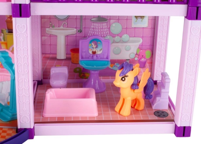 Ένα πολύχρωμο διώροφο κουκλόσπιτο για κούκλες και πόνι προσφέρει άφθονη διασκέδαση και αξεσουάρ για δημιουργικό παιχνίδι. Περιλαμβάνει φιγούρες πόνι και ένα σκυλάκι, έπιπλα για την κουζίνα, την κρεβατοκάμαρα και το μπάνιο, καθώς και μπαλκόνια και ταράτσα για σκηνές εξωτερικού χώρου. Ιδανικό για παιδιά από 3 ετών που αγαπούν φανταστικές ιστορίες, πλούσια αξεσουάρ και διαδραστικό παιχνίδι.