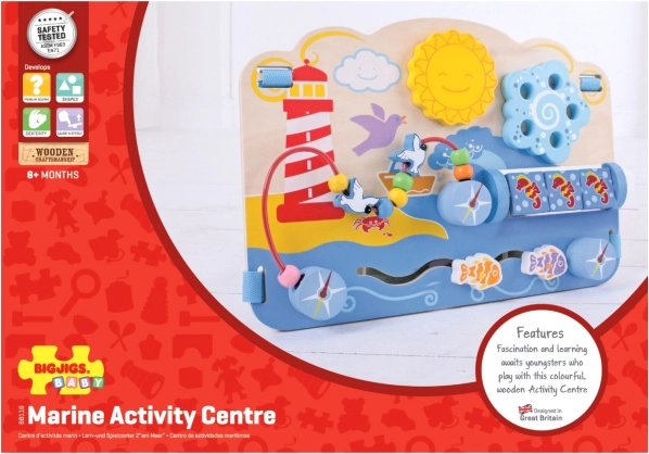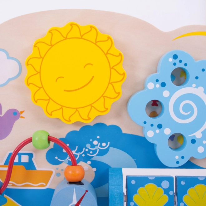 Αυτή η ξύλινη ενεργή σανίδα με ναυτικό θέμα προσφέρει στα παιδιά μια πλούσια γκάμα δραστηριοτήτων: περιστρεφόμενο λαβύρινθο, γυροσκοπικούς ιππόκαμπους, συρόμενα ψαράκια και σύρμα με χάντρες και γλάρους. Κάθε στοιχείο έχει σχεδιαστεί ώστε να υποστηρίζει τη φυσική ανάπτυξη δεξιοτήτων, την υπομονή και τη συγκέντρωση. Με τις ρυθμιζόμενες βάσεις στήριξης, η σανίδα στερεώνεται με ασφάλεια και στην κούνια, προσφέροντας στο μωρό πλούσια ερεθίσματα σε απόσταση αφής.