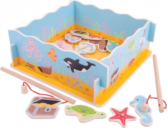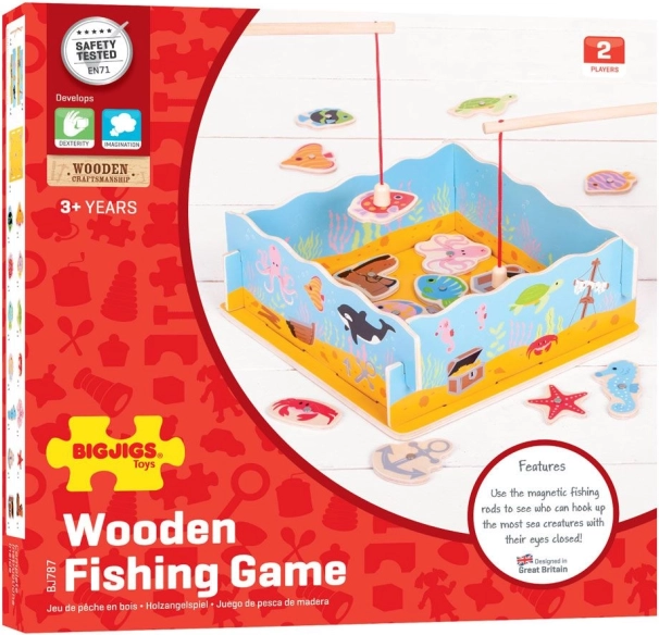 Με τα μαγνητικά καλάμια τα παιδιά «ψαρεύουν» 11 ψαράκια και άλλα κομμάτια, όπως σεντούκι θησαυρού, παπούτσι και άγκυρα, και εξασκούν την ακρίβεια τοποθετώντας τα στις σωστές θέσεις. Η ποιοτική ξύλινη κατασκευή και τα ασφαλή χρώματα εξασφαλίζουν μεγάλη αντοχή και ασφαλές παιχνίδι.