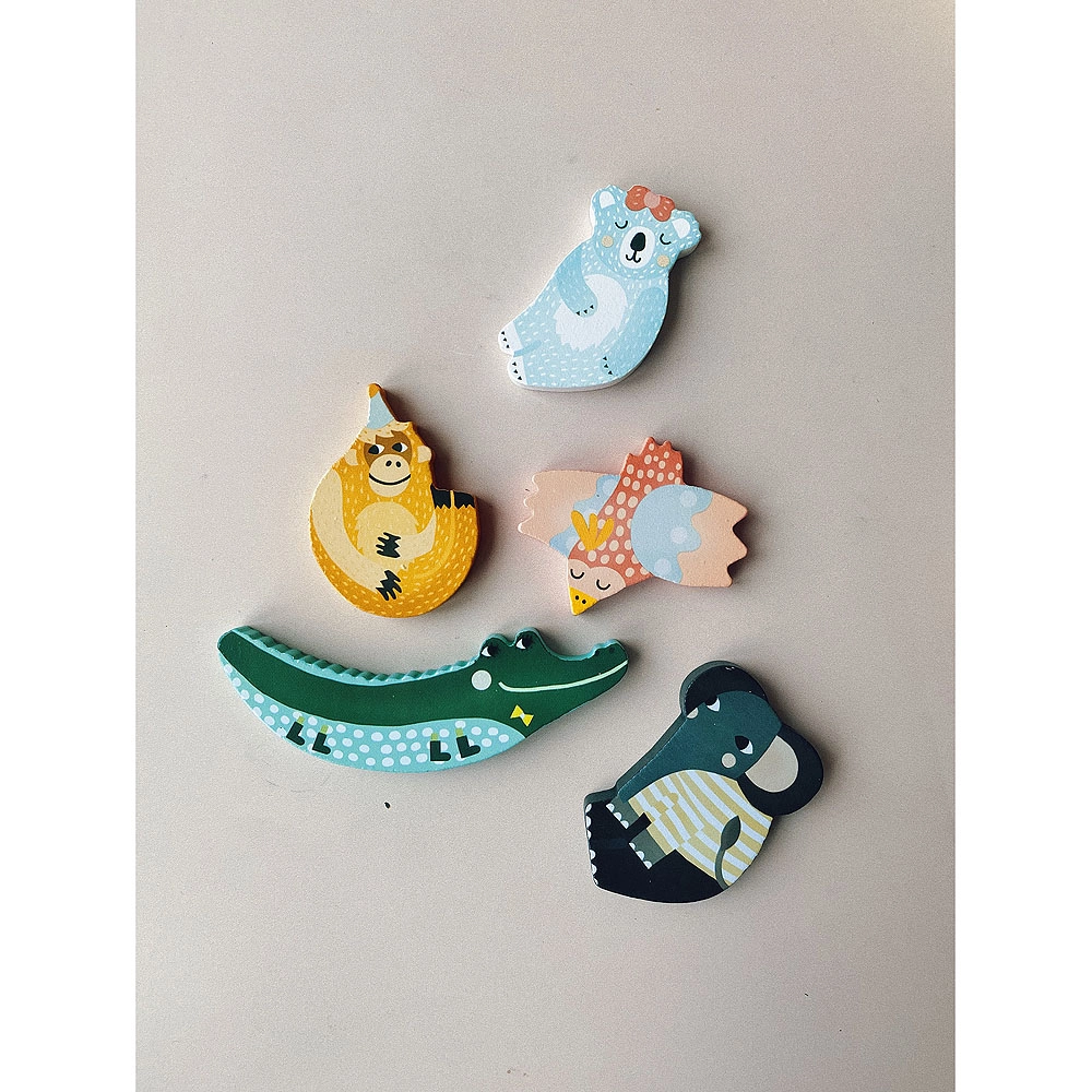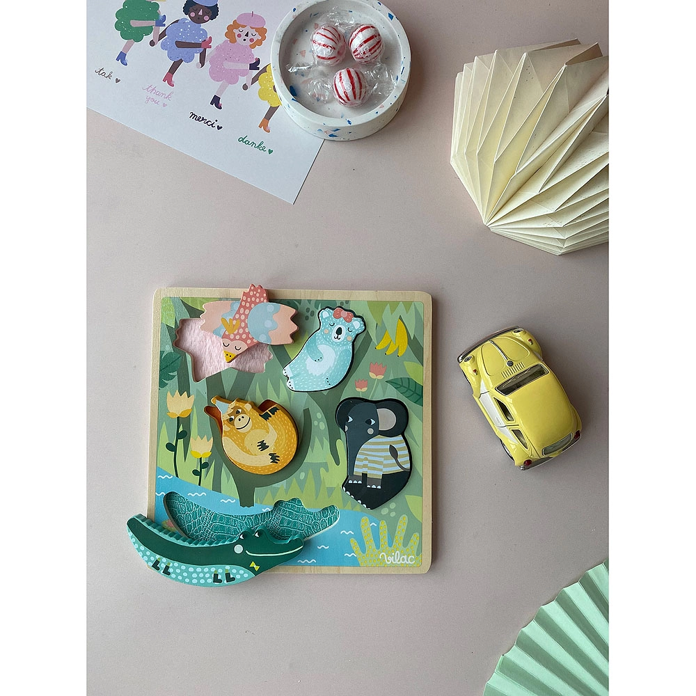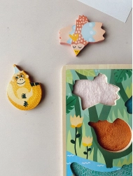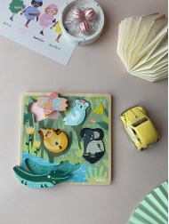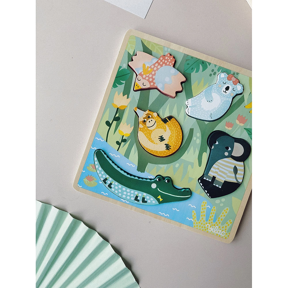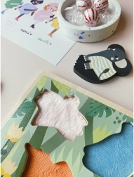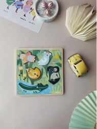 Ο σχεδιασμός της Michelle Carlslund με απαλές παστέλ αποχρώσεις δίνει στο παιχνίδι ελκυστική εμφάνιση και διεγείρει τη φαντασία. Η ξύλινη βάση με εγκοπές και ζωικά μοτίβα μαθαίνει στα παιδιά να αντιστοιχίζουν σχήματα, να αναγνωρίζουν χρώματα και ζώα. Το παζλ είναι ανθεκτικό, ασφαλές και κατασκευασμένο από ποιοτικό ξύλο σε συνδυασμό με υφάσμα.