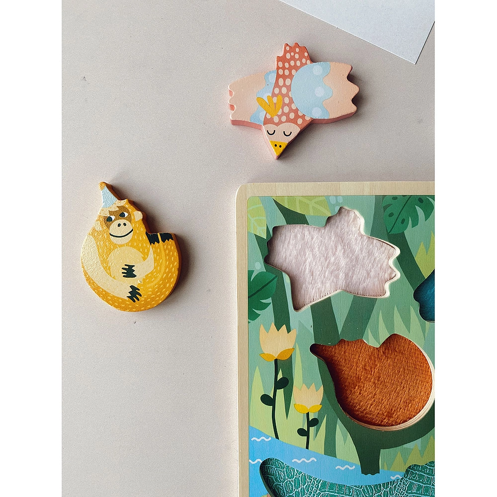 Αυτό το ποιοτικό ξύλινο παζλ προσφέρει στα παιδιά χαρά στην ανακάλυψη και τη μάθηση. Αφαιρώντας κάθε ζωάκι, τα παιδιά θα βρουν κάτω από το κομμάτι διαφορετική απτική επιφάνεια – απαλή, τραχιά ή με υφή – που αναπτύσσει φυσικά τις απτικές αισθήσεις και υποστηρίζει την αισθητηριακή ολοκλήρωση. Τα ανθεκτικά, εύκολα στο κράτημα κομμάτια ταιριάζουν τέλεια στα μικρά χεράκια.