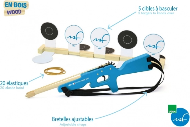 Το ξύλινο τουφέκι διαθέτει ρυθμιζόμενους υφασμάτινους ιμάντες, ιδανικούς για κάθε παιδί. Η συσκευασία περιλαμβάνει πέντε ανακλινόμενους στόχους και είκοσι λαστιχάκια για επαναλαμβανόμενες βολές. Δοκιμάστε να τοποθετήσετε τους στόχους σε διαφορετικές αποστάσεις και ελέγξτε την ακρίβειά σας!
