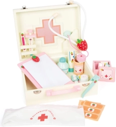 Χάρη στα ρεαλιστικά αξεσουάρ όπως στηθοσκόπιο, θερμόμετρο, σύριγγα, αλοιφές και φάρμακα, τα παιδιά καλλιεργούν κοινωνικές δεξιότητες, ενσυναίσθηση και επικοινωνία. Τα ανθεκτικά υλικά (ξύλο, ύφασμα και χαρτί) εξασφαλίζουν ασφαλές και ανθεκτικό παιχνίδι.